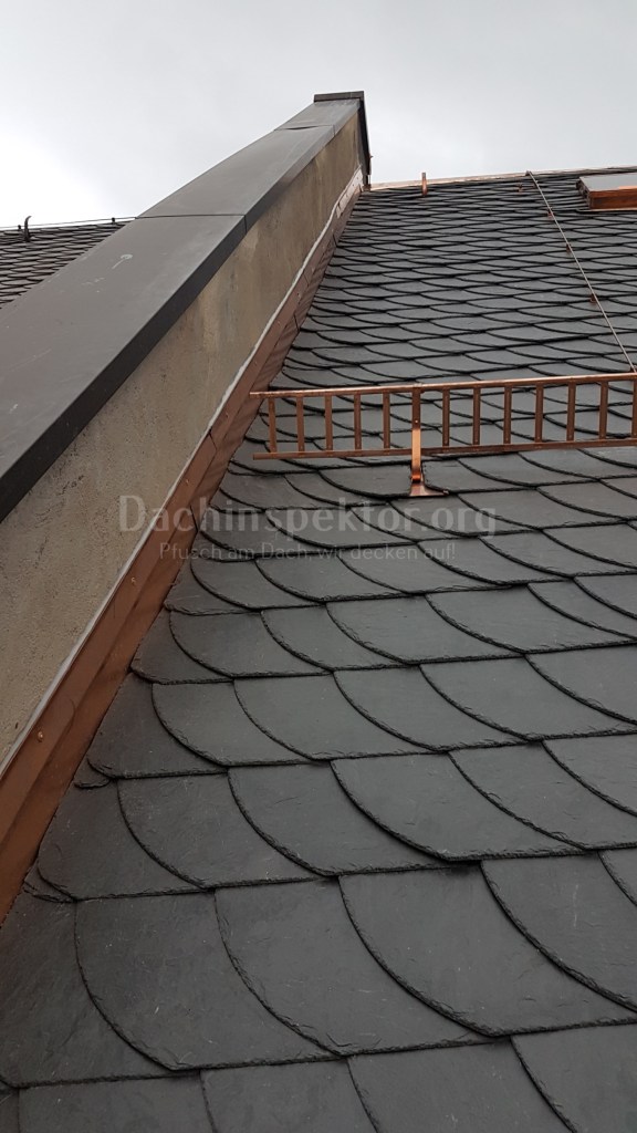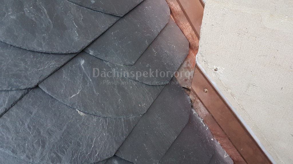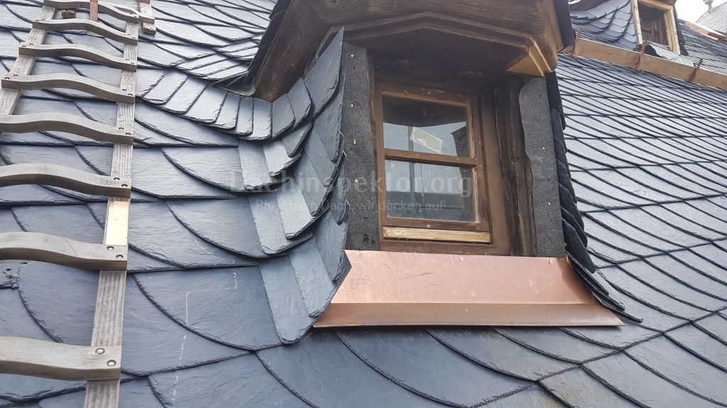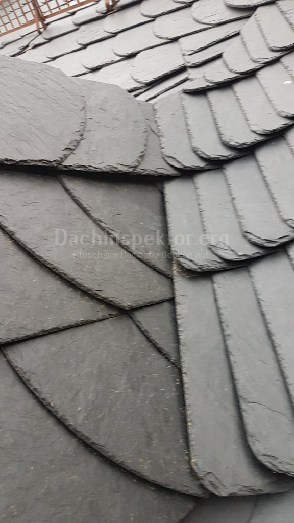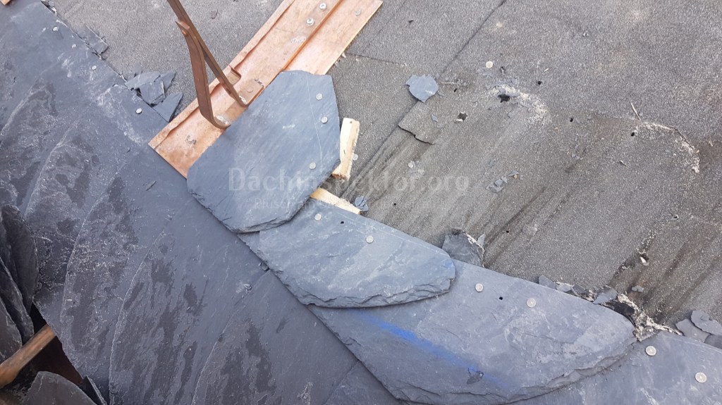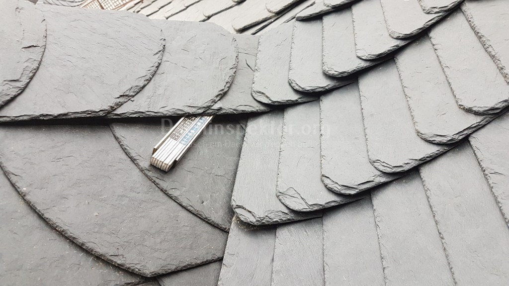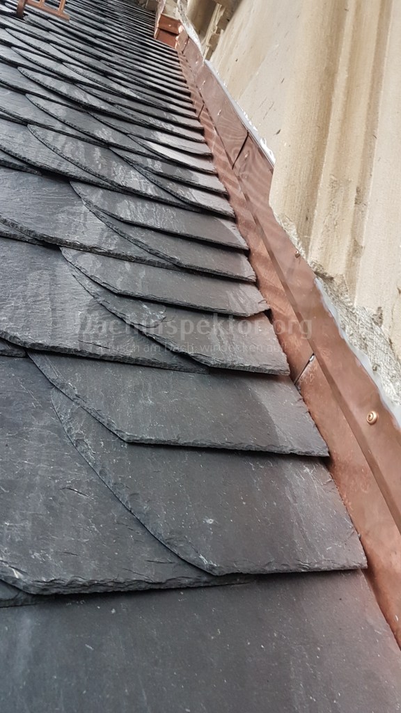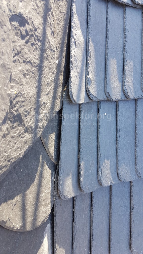 Diese Arbeiten wurden von einem kleinen Handwerksbetrieb gefertigt. Diese Betrieb ist diesmal kein Meisterbetrieb. Diese Arbeiten haben mit einer Schieferdeckung nichts zu tun. Es ist eine Schande für unser Handwerk.