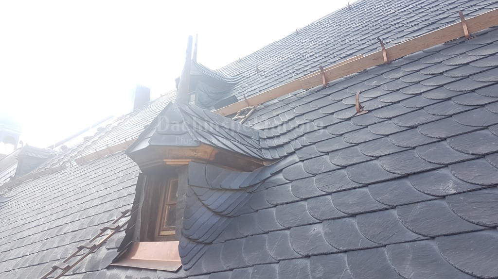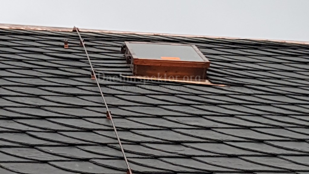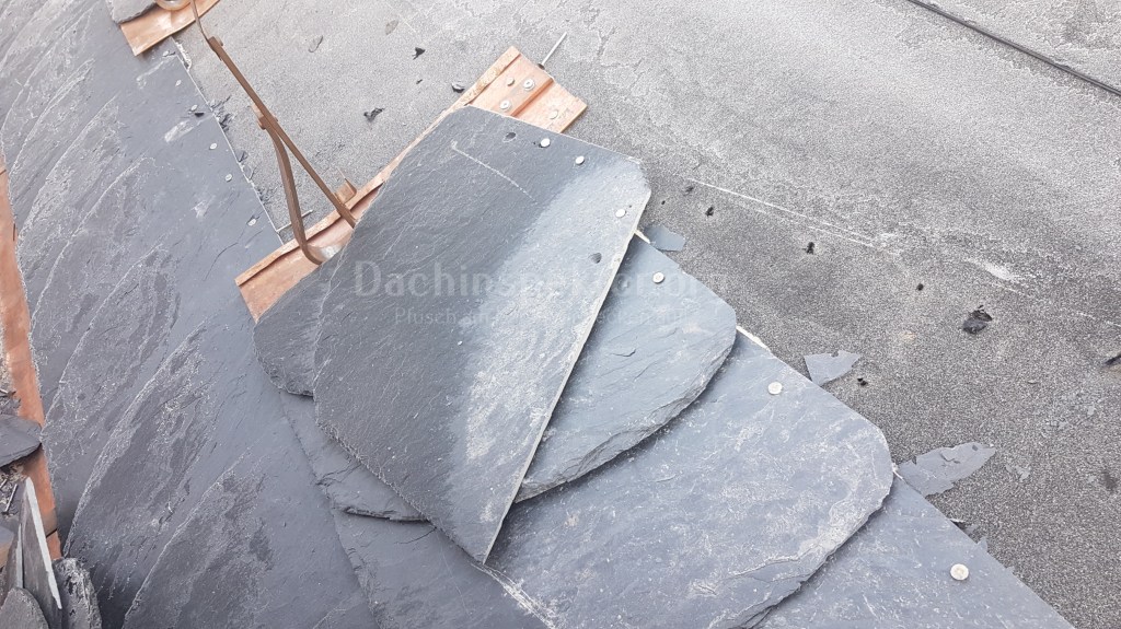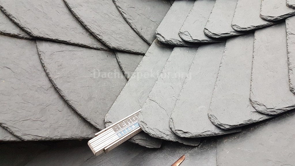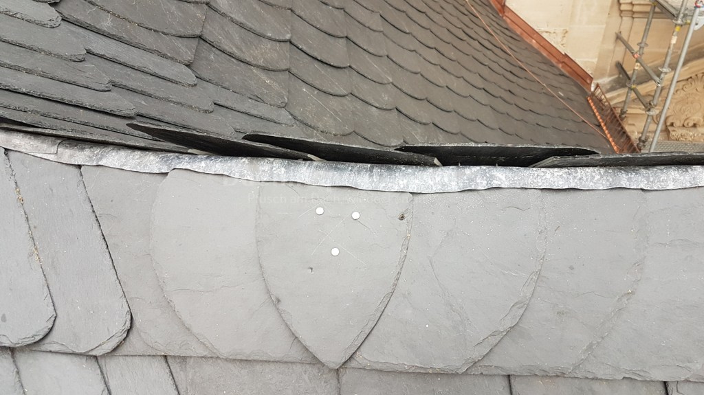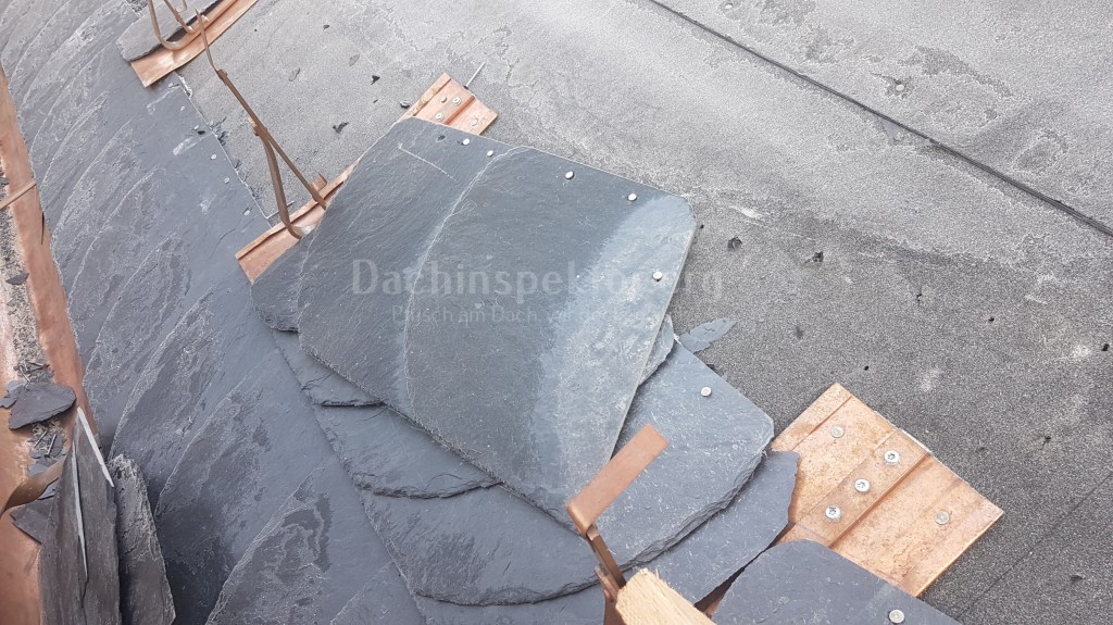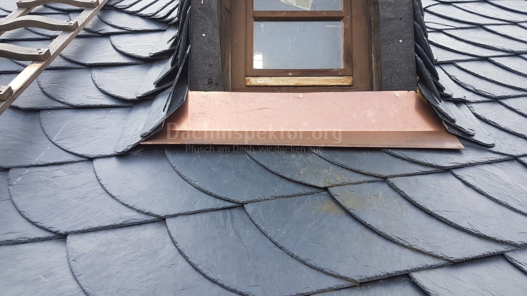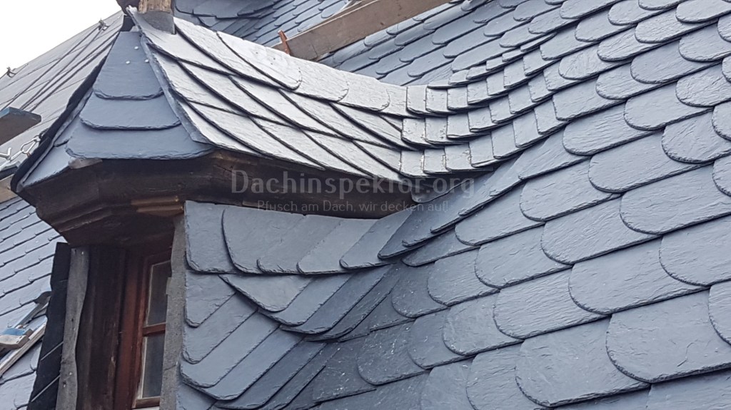 Diese Arbeiten wurden von einem kleinen Handwerksbetrieb gefertigt. Diese Betrieb ist diesmal kein Meisterbetrieb. Diese Arbeiten haben mit einer Schieferdeckung nichts zu tun. Es ist eine Schande für unser Handwerk.