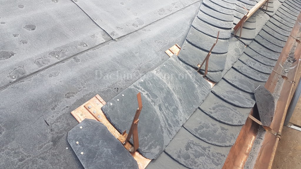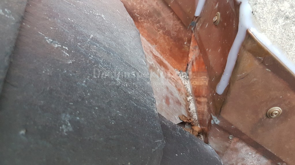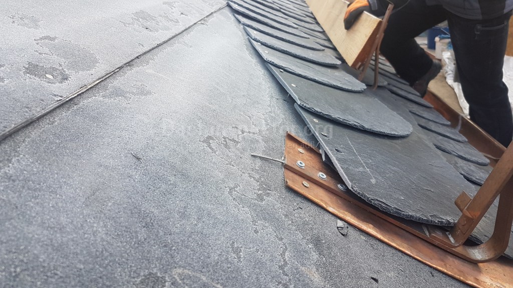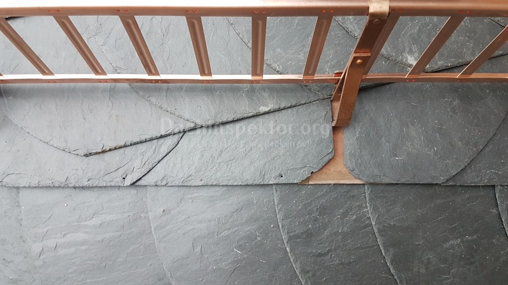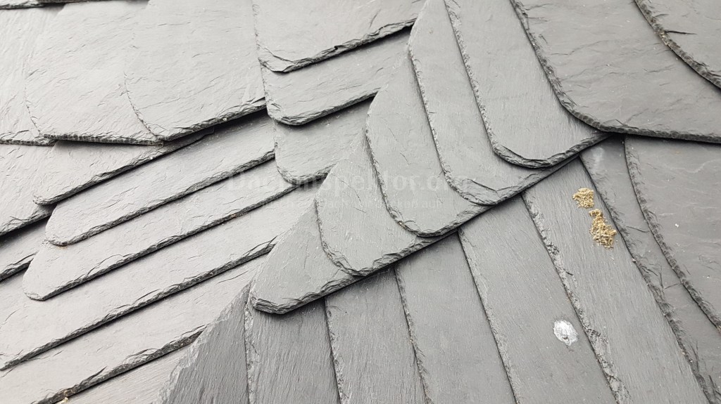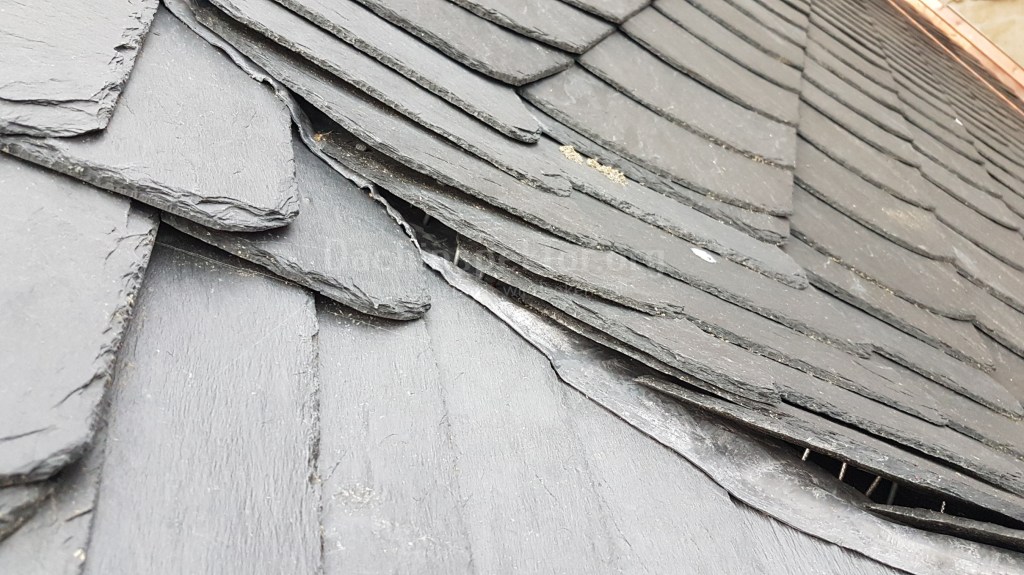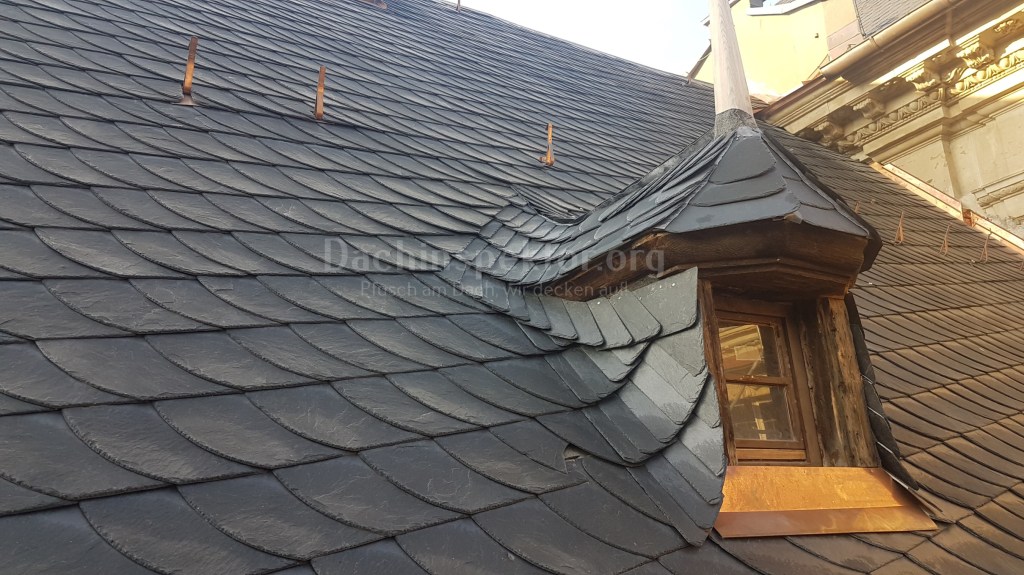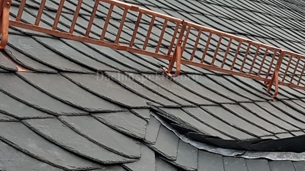Diese Arbeiten wurden von einem kleinen Handwerksbetrieb gefertigt. Diese Betrieb ist diesmal kein Meisterbetrieb. Diese Arbeiten haben mit einer Schieferdeckung nichts zu tun. Es ist eine Schande für unser Handwerk.