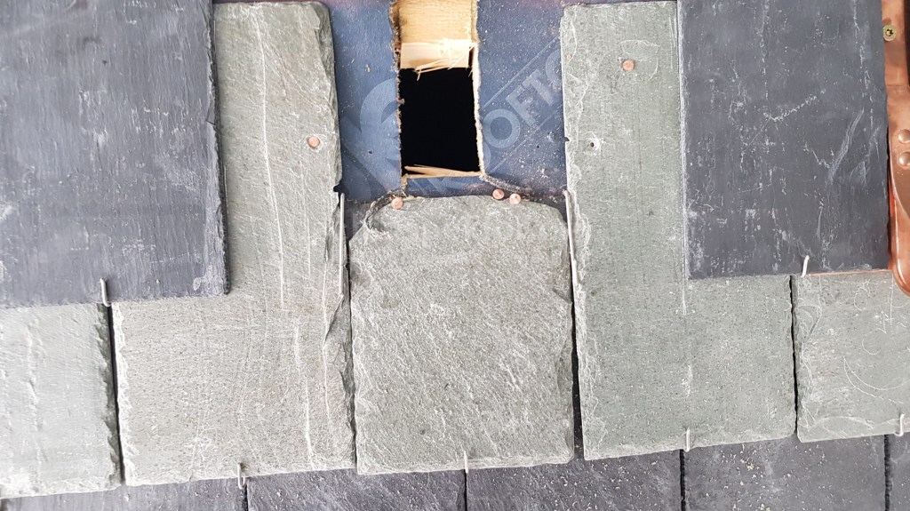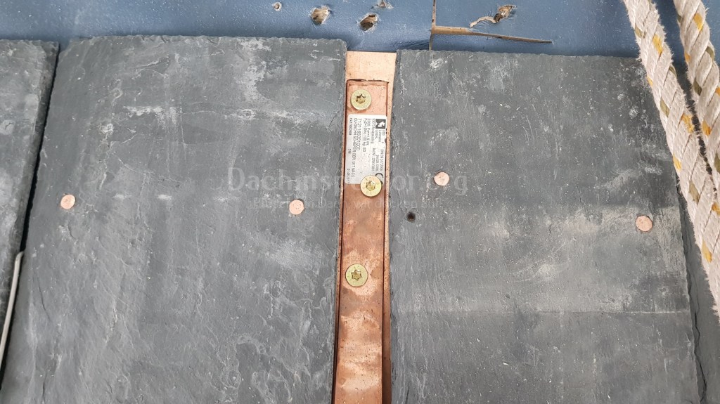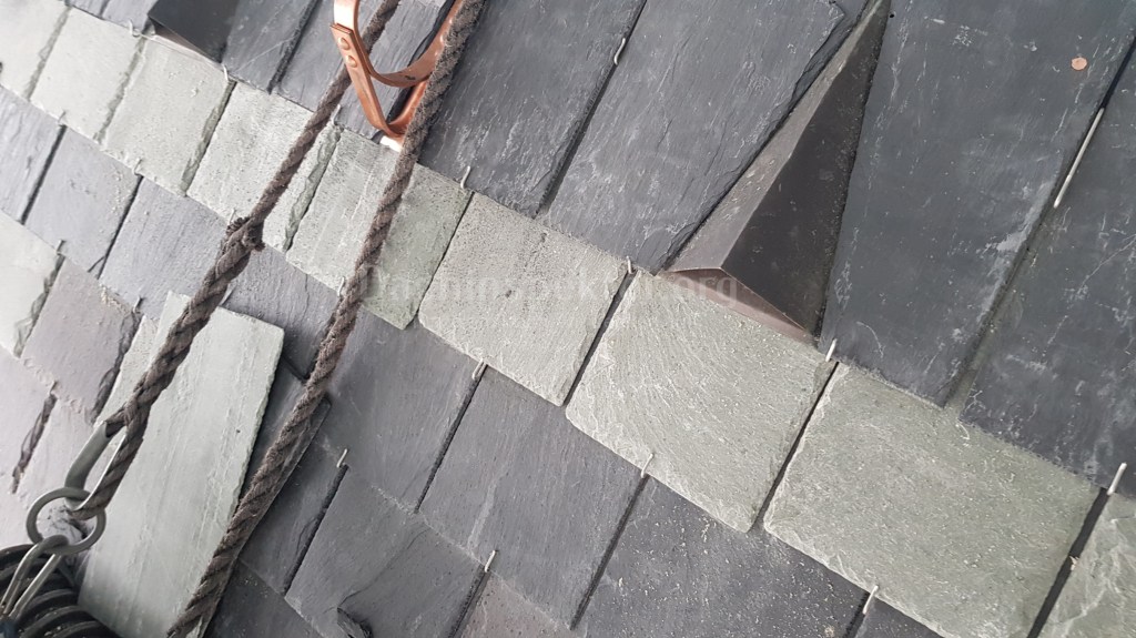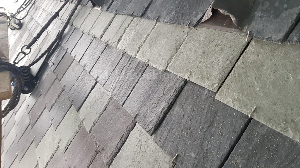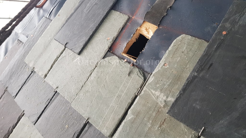 Diese Arbeiten deckten Dachdecker auf einer Kirche. Wir sehen sehr unsaubere Arbeiten, Schiefer sind locker und schlecht gedeckt.