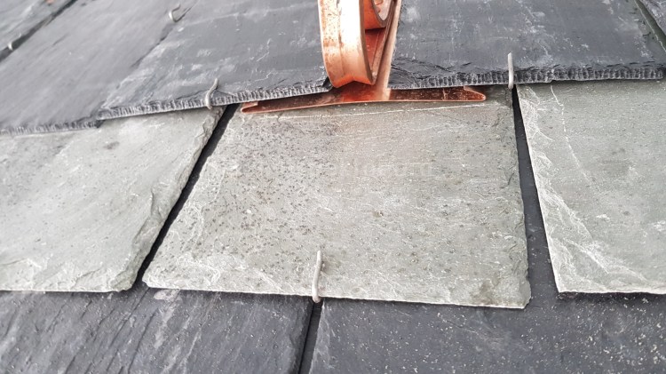 Diese Arbeiten deckten Dachdecker auf einer Kirche. Wir sehen sehr unsaubere Arbeiten, Schiefer sind locker und schlecht gedeckt.